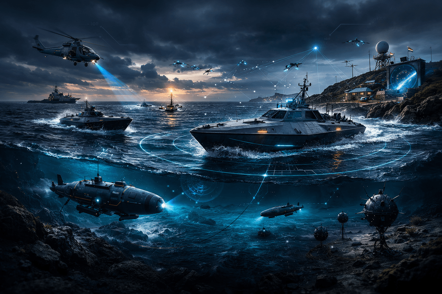 Localization and deployment of autonomous maritime platforms for coastal and offshore defense operations.